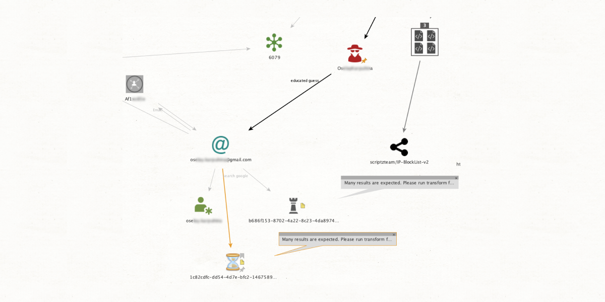 In the next step, we're scrutinizing the previously found email address. One of our matches at this step is another SL ISE node that gives us the associated username “oselateinertia.” Although this alias seems disposable, exploring its activities reveals essential details, such as another email address (oserunner) and two IP addresses.