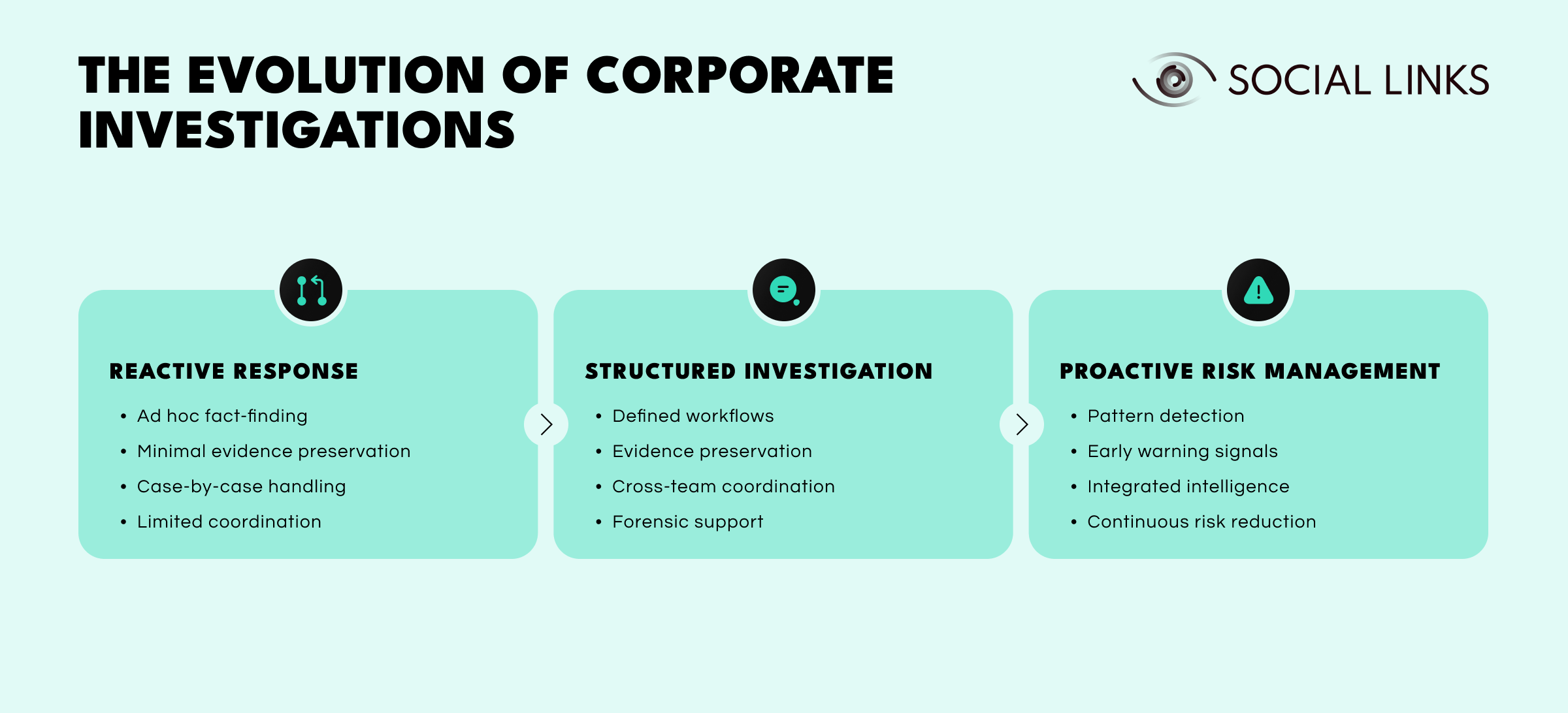 At the most basic level, companies investigate only after an allegation surfaces or damage becomes visible. The work is usually ad hoc and centered on resolving the immediate issue in front of the team.