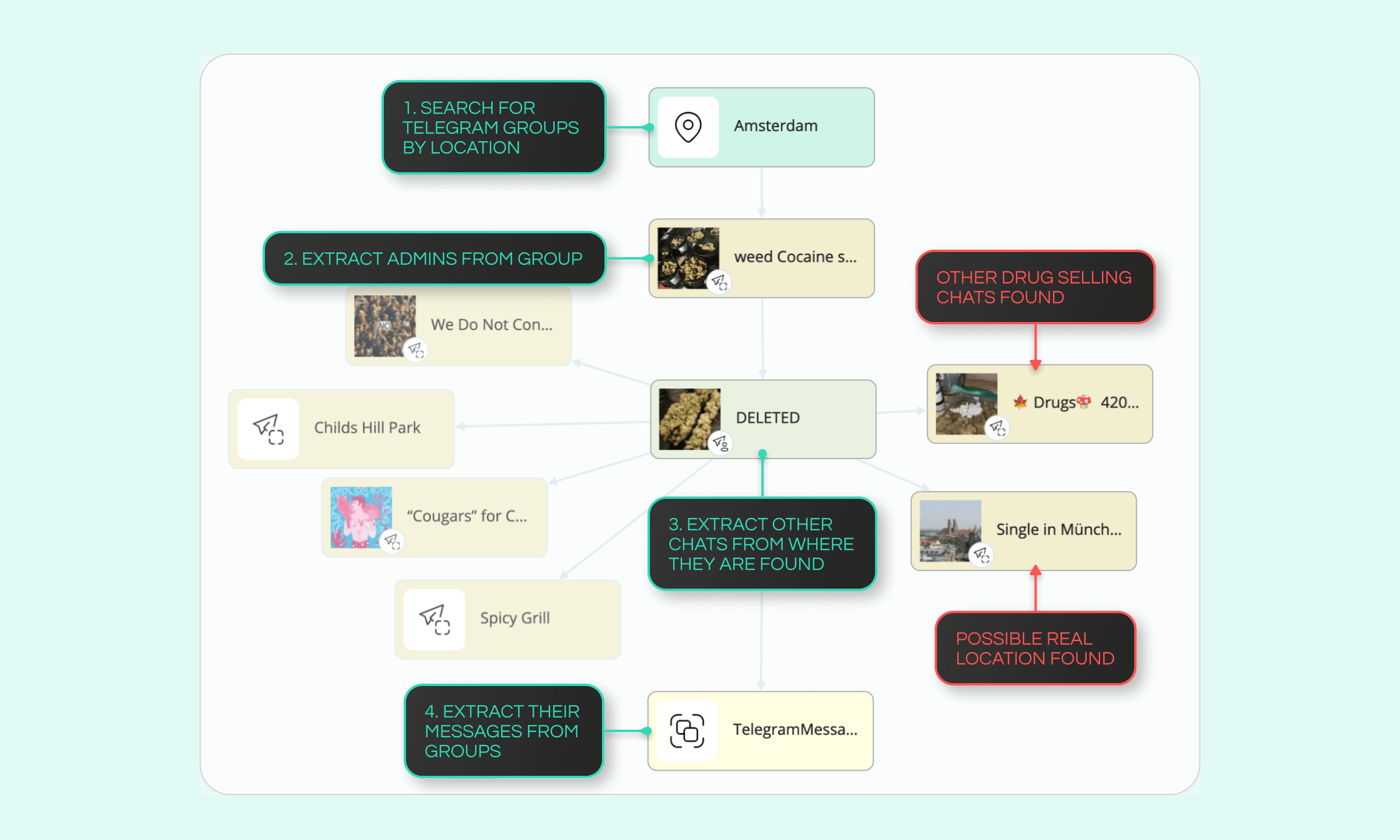 Step 1: Run Geolocation Search. Many Telegram groups are linked to specific locations, for example, for drug deals that are to be conducted locally.
