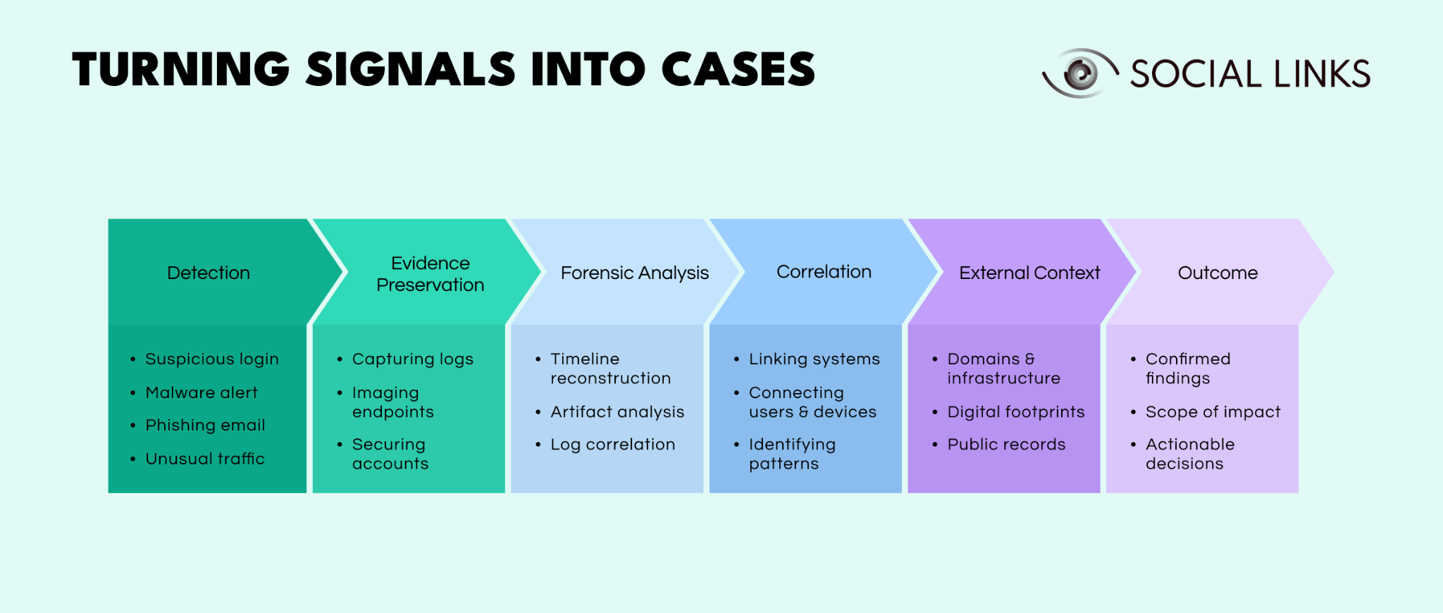This is where Social Links adds value. It helps investigators connect internal artifacts to external context—domains, entities, digital footprints, and relationships—so they can understand what those signals represent.