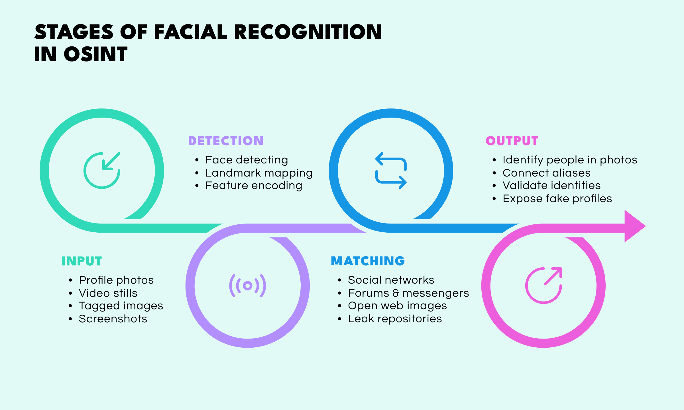 Traditional OSINT relies on text-based inputs such as usernames, emails, domains, or phone numbers. But as anonymization tools grow ever more sophisticated, investigators are increasingly depending on facial recognition technology to establish cross-platform identity correlation.