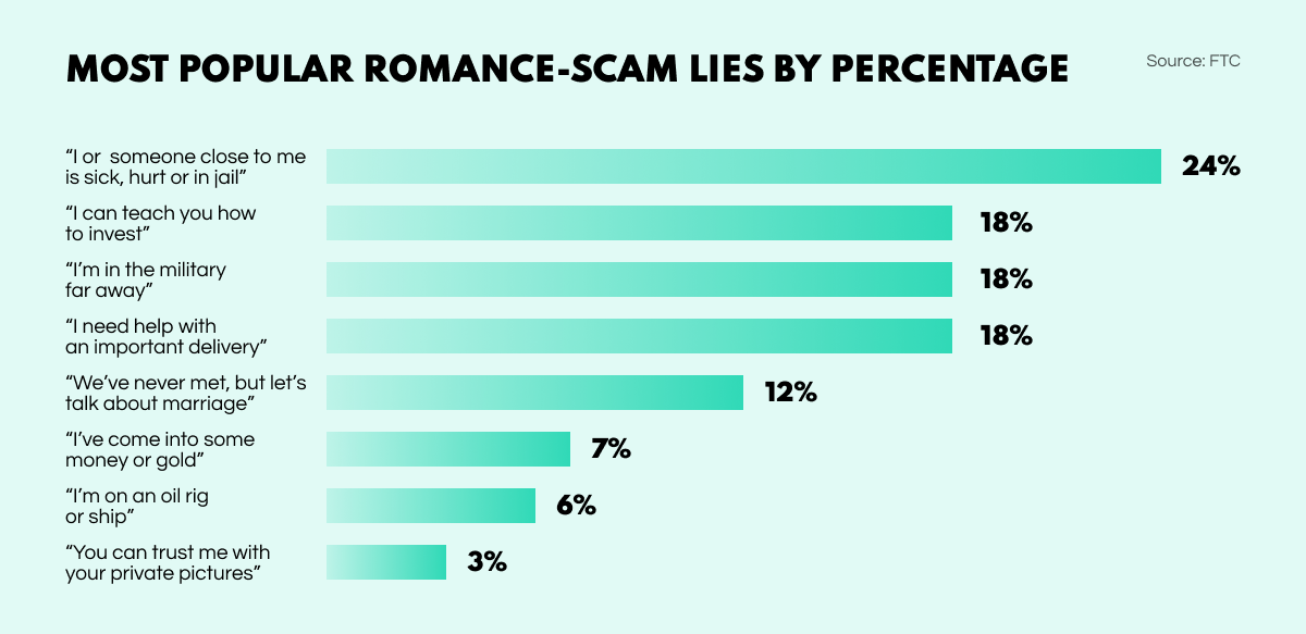 Figures are based on 8,070 2022 romance scam reports that indicated a dollar loss and included a narrative of a loast 2,000 characters in length. Lies were identified using keyword analysis of the narratives.