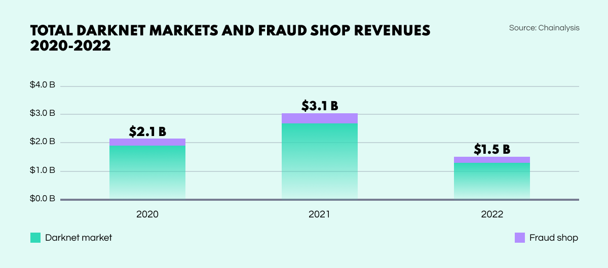 According to a new report by Chainalysis, darknet marketplace revenues fell by 50% in 2022 as a direct result of Hydra’s seizure, with a dramatic drop across the board from 2021’s $3.1B to last year’s $1.5B. In the immediate wake of the marketplace’s closure, the daily average revenue collapsed from $4.2M to just $447k.