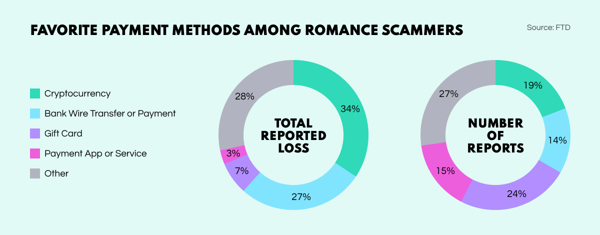 Sweetheart scammers are favouring cryptos and gift cards as payment methods—no doubt in the interests of preserving their anonymity. Crypto tops the list in terms of dollar amount, while gift cards account for most instances.