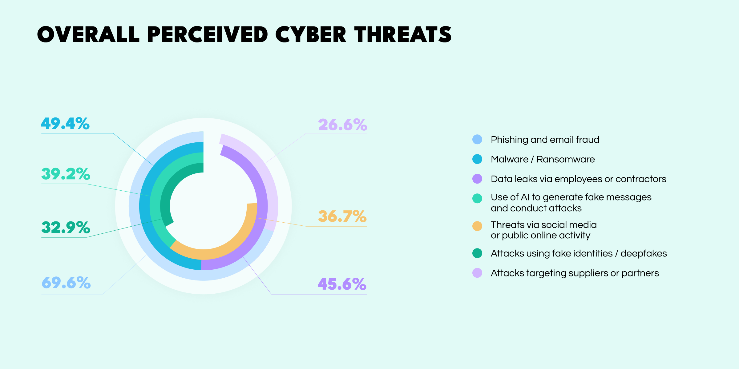• AI-Enhanced Threats: 39.2% cited fake messages, and 32.9% cited attacks from deepfakes or fake identities