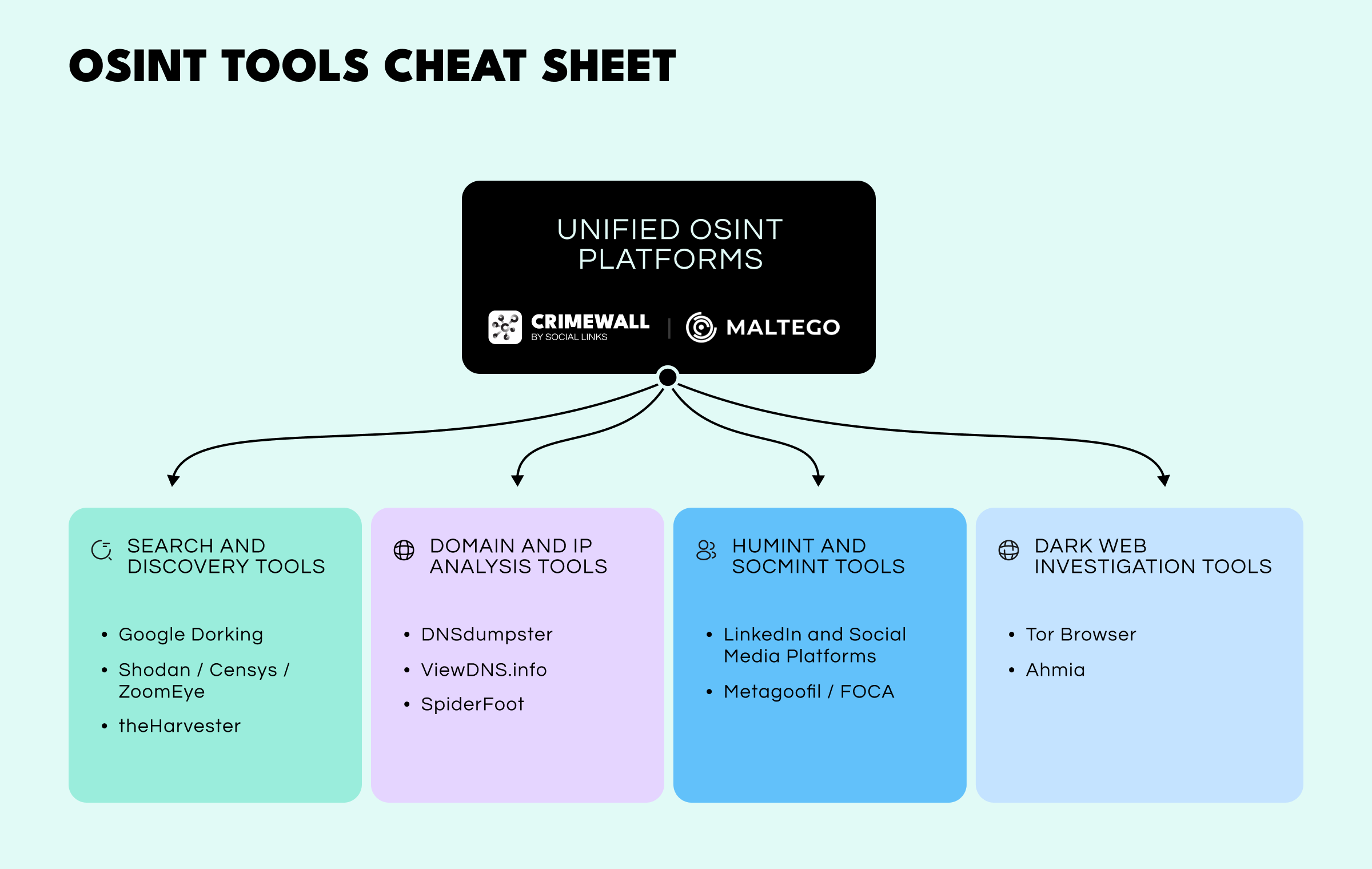 No single OSINT tool can handle everything. A well-rounded toolkit combines multiple capabilities, each suited to a specific task. The goal is to create an ecosystem that scales with the complexity of the mission. Below are the main categories of tools that make up a modern analyst’s arsenal.