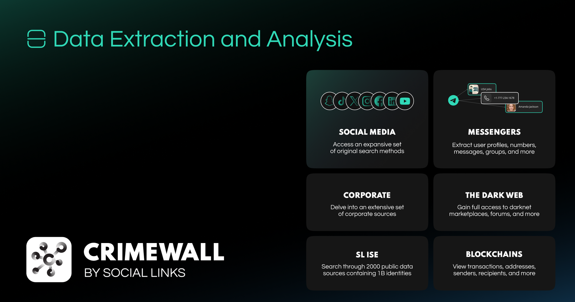 Meet SL Crimewall—a full-cycle OSINT investigation platform that simplifies the entire intelligence cycle, from data extraction across 500+ data sources, through visualization and processing, to the final report. This is Social Links’ first standalone OSINT solution.