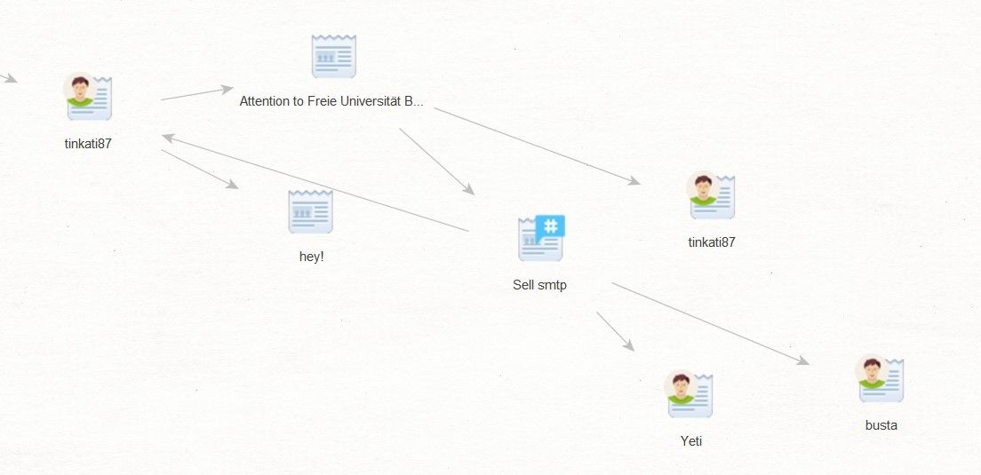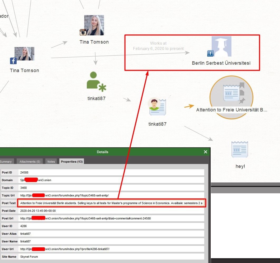 Here's the proof. A user under the nickname tinkati87 on the Skynet Forum sells answers to exam tests at the University of Berlin. And as we have already established earlier, this is where she works. And she is on Instagram under the same nickname. We can also download the forum topic to the graph and retrieve the accounts of those other users who participate in the discussion so that in the future, we can try to identify students who may have bought the answers to the test from her.