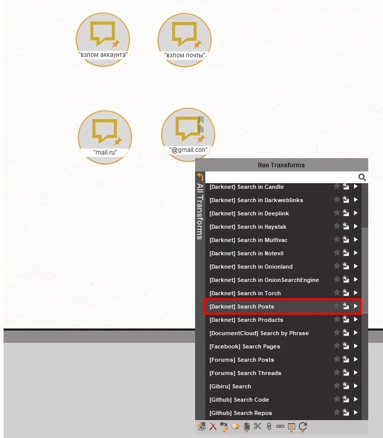 Now let's get down to something more interesting – search for information by given keywords. It's like Google. Take 'Entity: Phrase' and set the required word/sentence there. Apply 'Transform: [Darknet] Search Posts' and get various posts on various forums that contain this phrase.