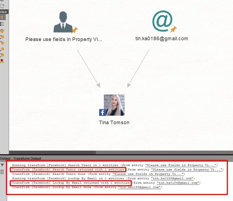 What should we do next? Let's look for the same account on Facebook. Run 'Transform: [Facebook] Lookup By Email' and, as a result, we get a Facebook account.