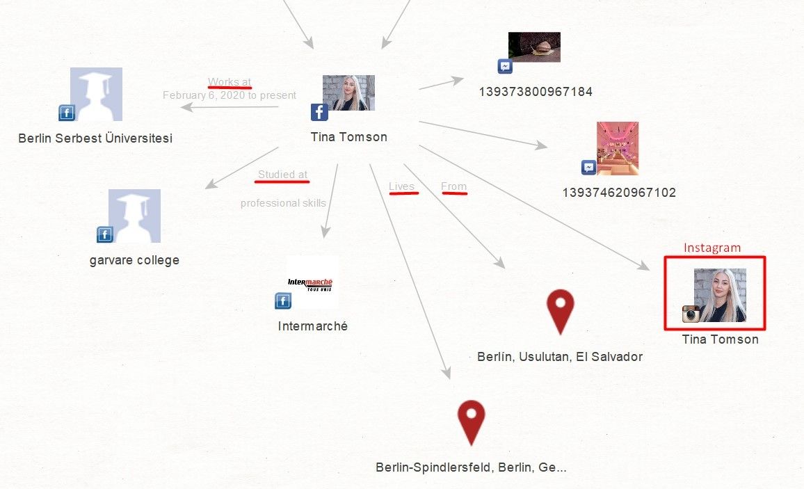 We move on and make a query for all the data from her Facebook page to be put in one graph by running 'Transform: [Facebook] Get User Details.’ We get additional information about her workplace, study, or residence (if this information is on her Facebook profile). The bonus is her Instagram account.