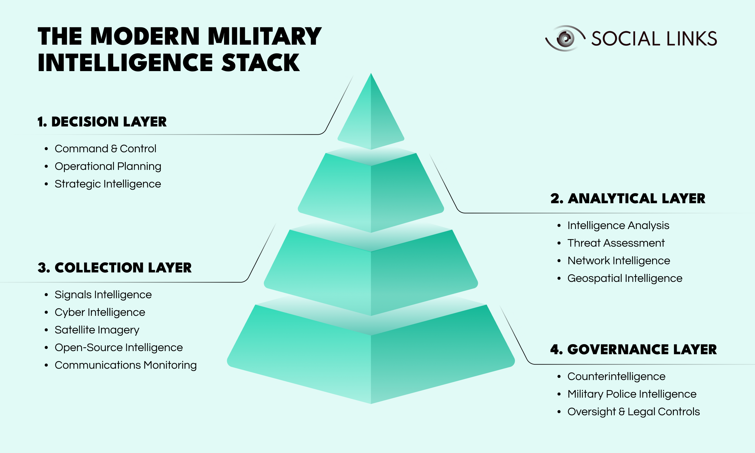 To understand how the system operates, it helps to view it as a layered model—the military intelligence stack. This framework shows how four interconnected layers work together: governance, collection, analysis, and decision-making.