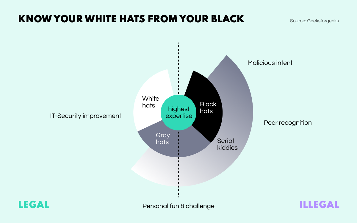 However, as with many things in our world, cybersecurity specialists cannot be strictly grouped into good and evil camps. Some specialists don’t set out to steal data or ruin corporate systems, yet take part in activities that can hardly be considered purely legal or ethical. These people fall into the category of ‘gray hats’, and they do what they do not so much to cause trouble per se, but to build up a reputation.