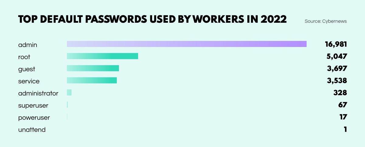 A crazy number of people are still ill-advisedly using passwords that can readily be guessed. Most of these typically consist of expletives, celebrities, cities, or keyboard sequences. Worse still, employees with access privileges seem to be as blasé as anyone else. According to recent research by Cybernews, the top 3 default passwords used by workers were ‘admin’, ‘root’, and ‘guest’.