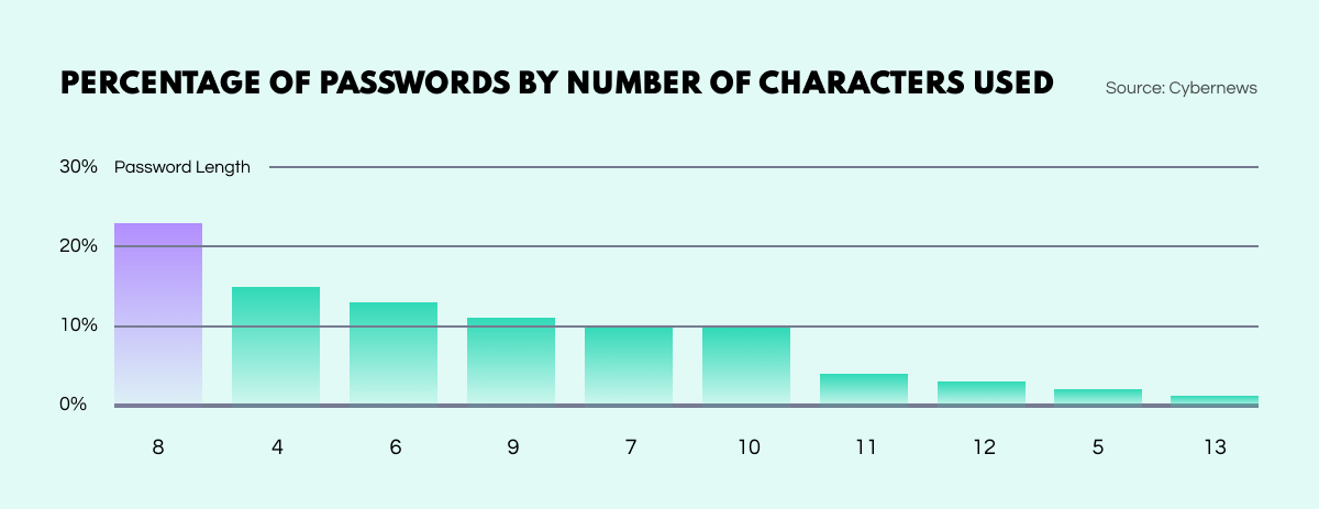 Furthermore, of all the passwords observed by the Cybernews team, just a staggering 1% met all of the criteria recommended by the cybersecurity industry. Only 4% contained 12 characters or more, including letters, numbers, and symbols. 14% used just 4 characters while 48% stretched to the range of 8 to 11.