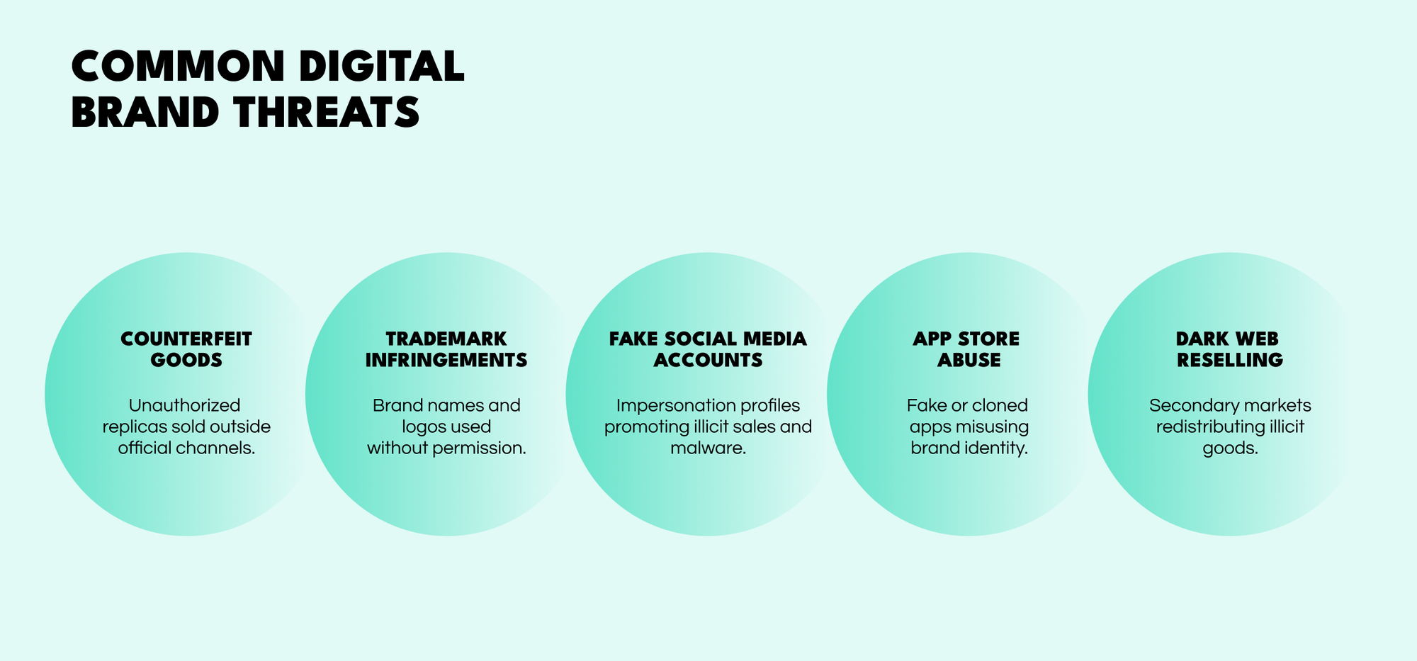 Key threats include counterfeit goods, trademark infringements, fake social media accounts, app store abuse, and dark web reselling, all of which often overlap.