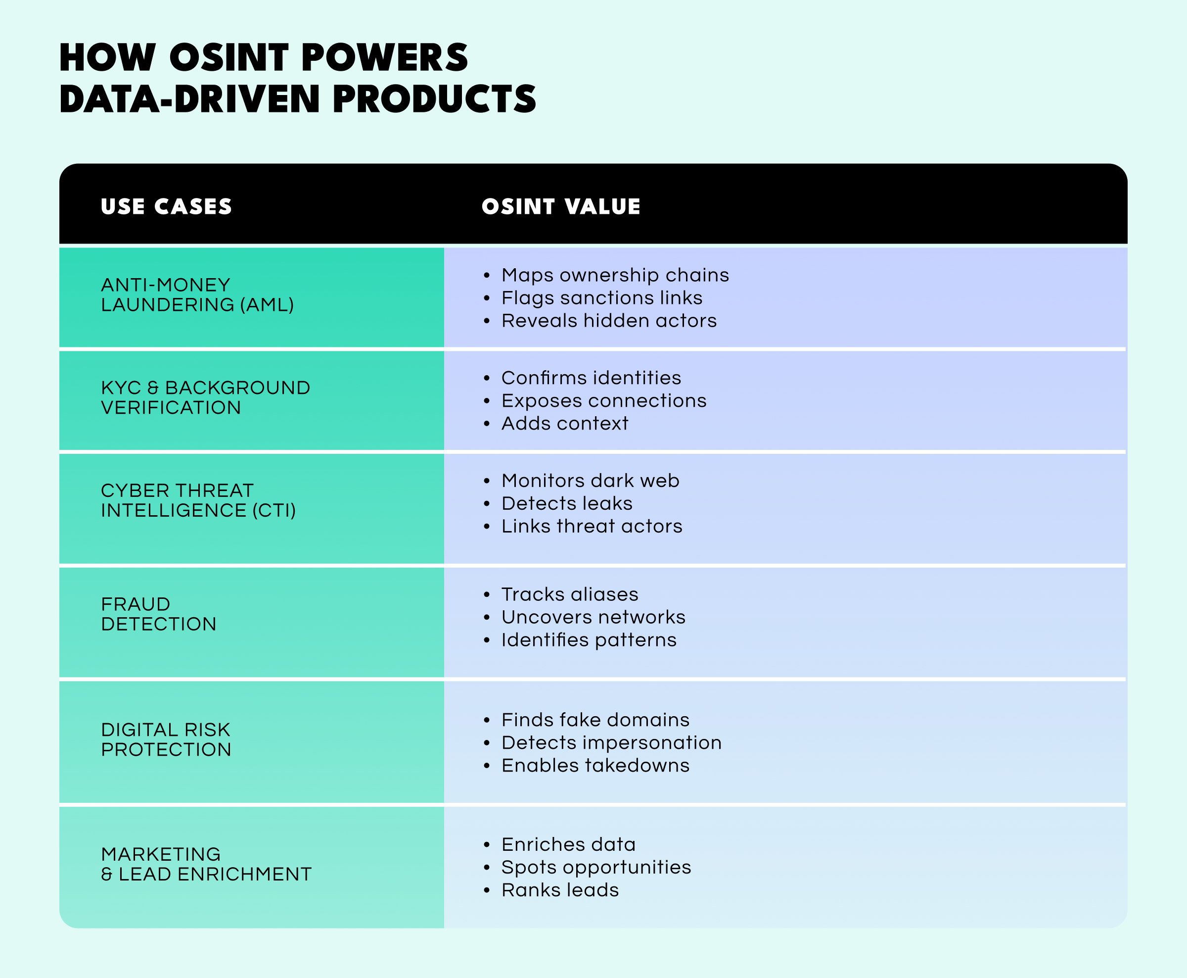In this article, we explore how open-source intelligence (OSINT) methodology is reshaping data-driven products across industries. By integrating legally accessible, real-time data from the open web, OSINT expands the boundaries of what products can analyze, detect, and predict. From fraud prevention and AML to marketing analytics and cyber defense, OSINT is transforming static datasets into dynamic intelligence engines.
