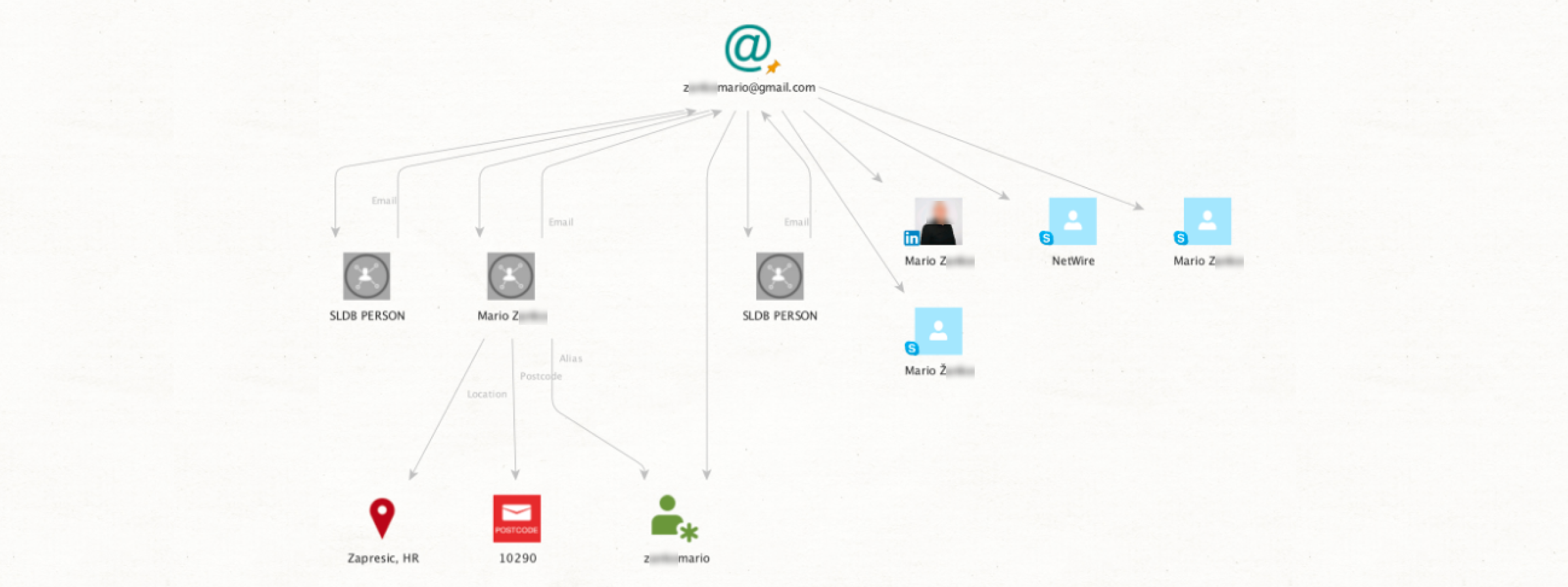 Let’s put things into practice with an example using SL Professional. Our input is an email address (zankomario) linked to a Trojan virus called NetWire. We use the [Skype] Get Profile transform, which provides the associated account (labeled NetWire). Next, the [LinkedIn] Get Profile transform reveals that the subject's registered location is Zapresic in Croatia. Finally, the [SL ISE] Search yields three entities with the same postal code in Zapresic. Furthermore, the alias from the last transform matches our original email address. This provides enough data to investigate a suspect's social media accounts.
