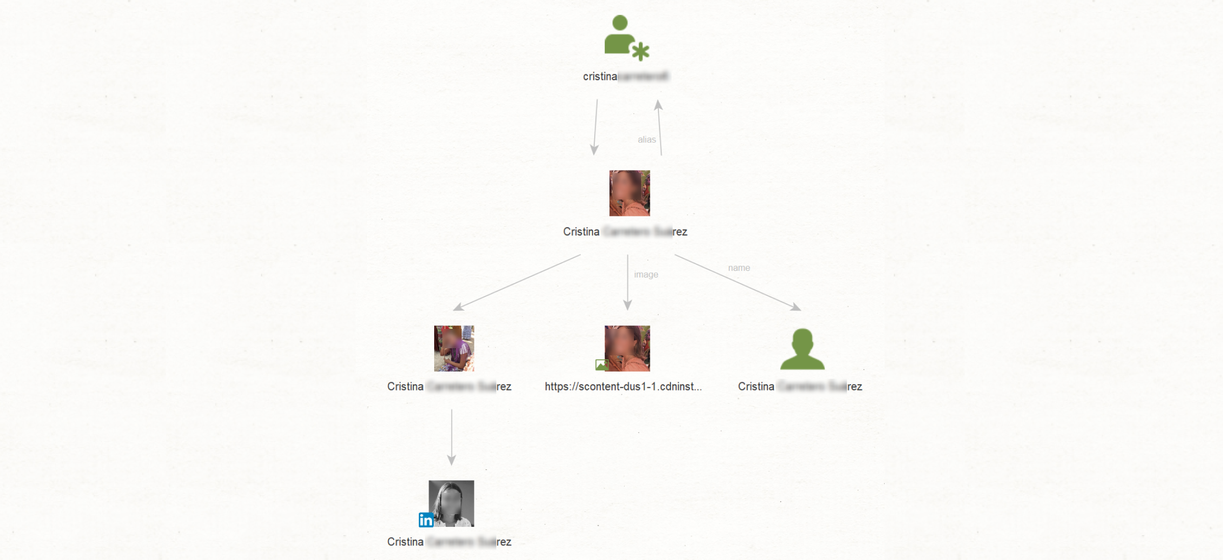 Let’s say we have two individuals and want to see if they are connected. First, we need to check if they have any online association with one another. There are several ways of verifying links, such as interactions (reposting content, likes, tags, etc.), location proximity, or overlaps in their social or professional circles. If one or more of these is true, there’s a strong chance that the individuals are connected somehow. In a real investigation, social media is one of the first places specialists look at to get an idea of how people are connected.