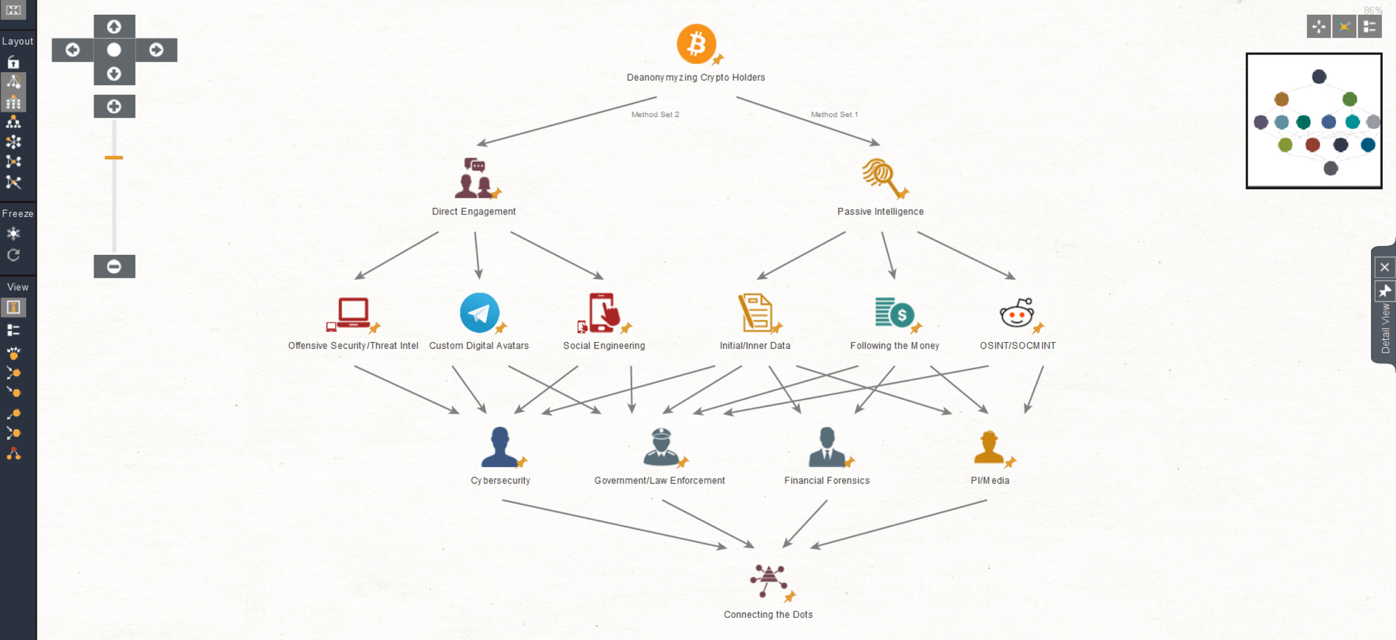 Passive Intelligence, or the traditional “follow the money” approach. It combines social media intelligence and financial data sources. The process begins with investigators tracing transactions and linking them to bank accounts. They can then use Cryptocurrency Pack transforms to include additional parameters in the search, such as location or social media data. Through cross-referencing results, investigators can reveal the identity of the wallet owner.