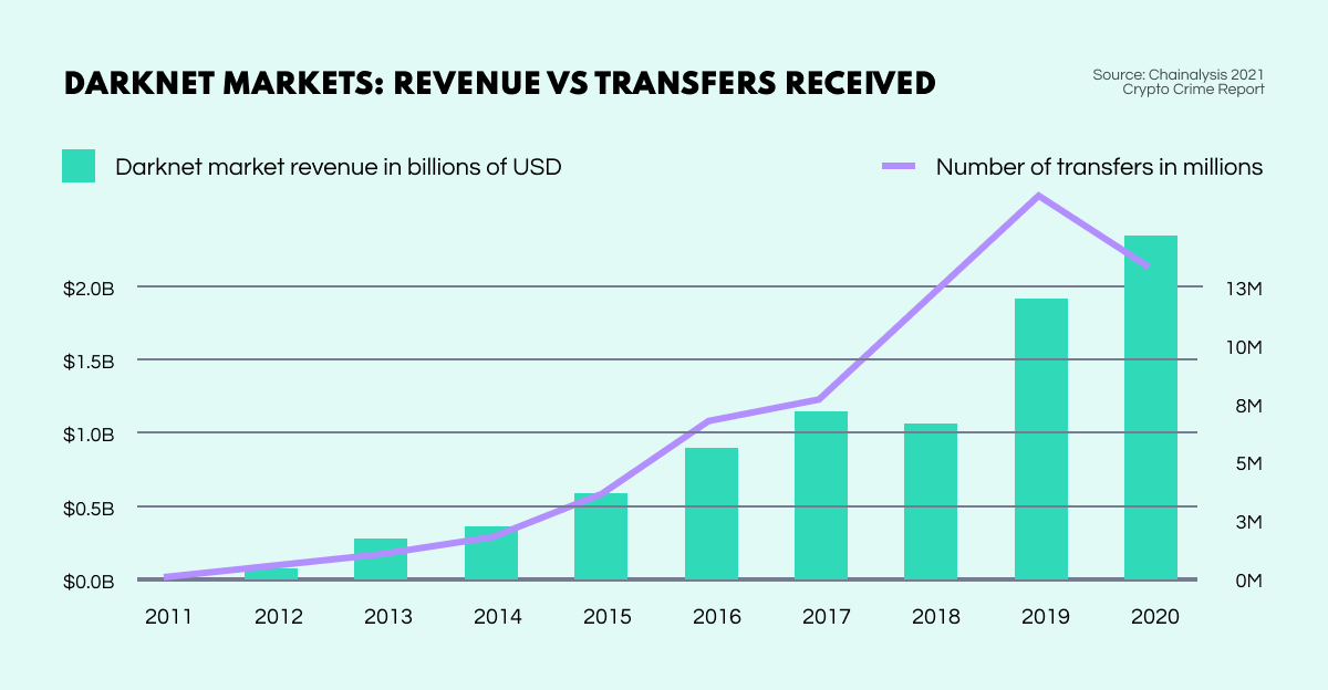 Then with the advent of Bitcoin in 2009, darknet marketplaces exploded. The combination of a cryptographically concealed platform and an anonymous digital payment system allowed markets on the Dark Web to flourish, attracting a huge influx of both vendors and customers. By 2020, income from darknet markets had exceeded $2 billion USD.