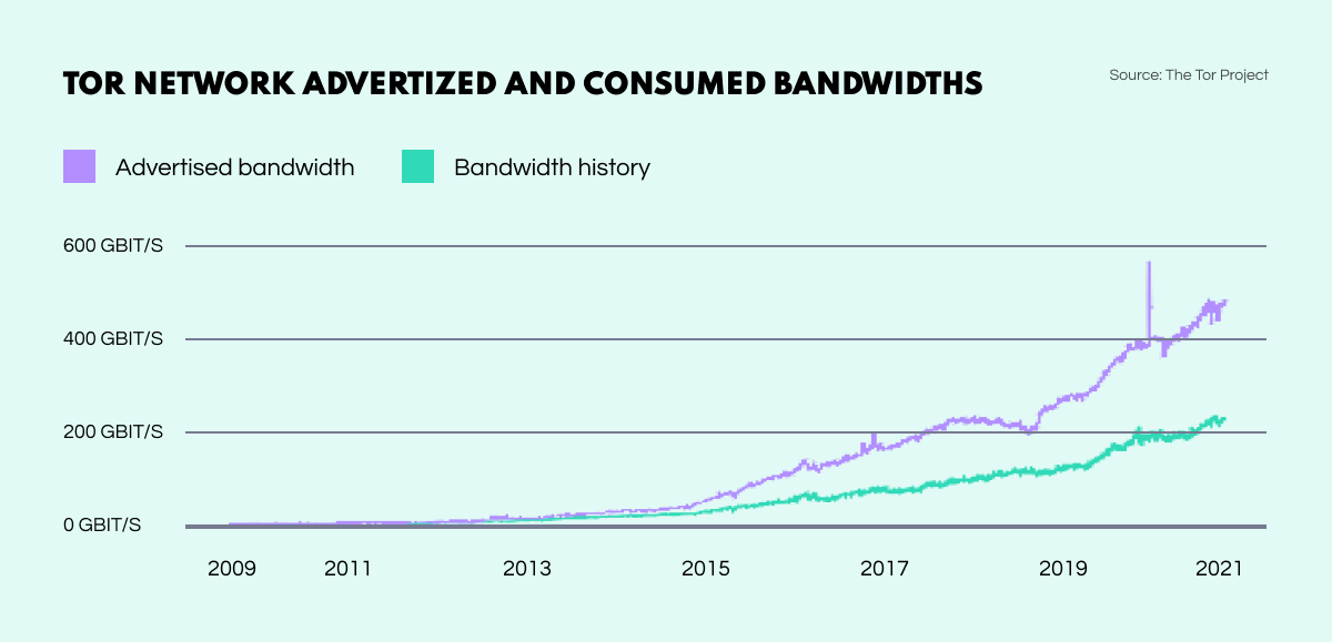 TOR’s immense rise in popularity is reflected in the browser’s bandwidth which has seen a dramatic increase over the last decade. From practically 0 Gbit/s in 2010, TOR’s traffic had reached a huge 400 Gbit/s by 2021. As of 2019, the browser had 2.5 million daily users and 7000 active routers worldwide.