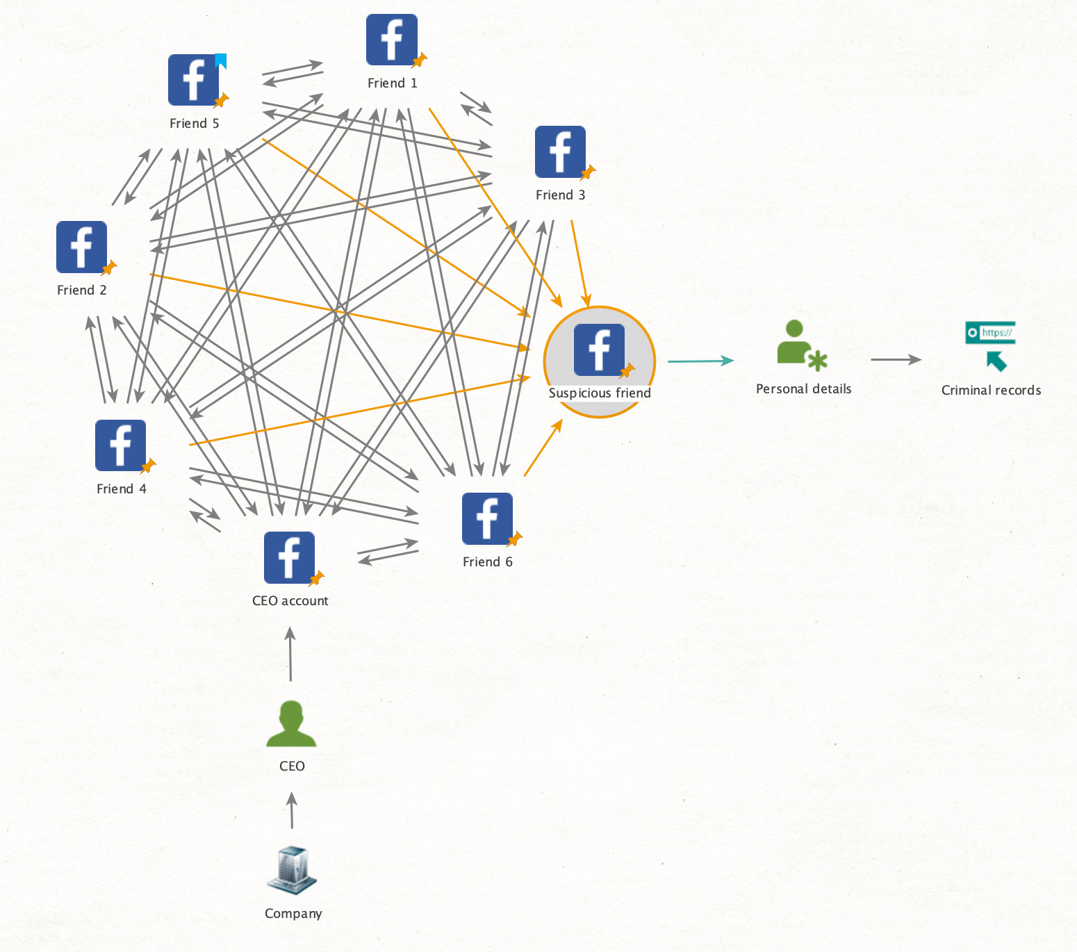 To start off, our client began by running [Facebook] Search and [Facebook] Get Friends transforms to obtain information on Company B’s CEO’s acquaintances. Then, using the [Facebook] Get Coworkers Ever and [Facebook] Get Details search methods, our client revealed a network of strongly interconnected friends, except for two individuals: Company B’s CEO and Account X.
