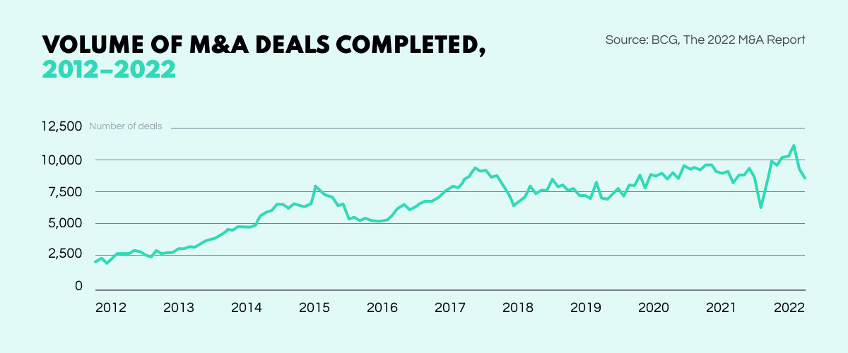 2022 saw 36,704 deals take place. Though the number did not break the record highs of 2021, the average deal value increased by 9%. While the demand for top-quality due diligence remains high, inconsistent analysis and changing economic conditions lead to 70-90% of M&A transactions falling through, requiring businesses to adapt to newer ways of operating to gain a competitive edge.