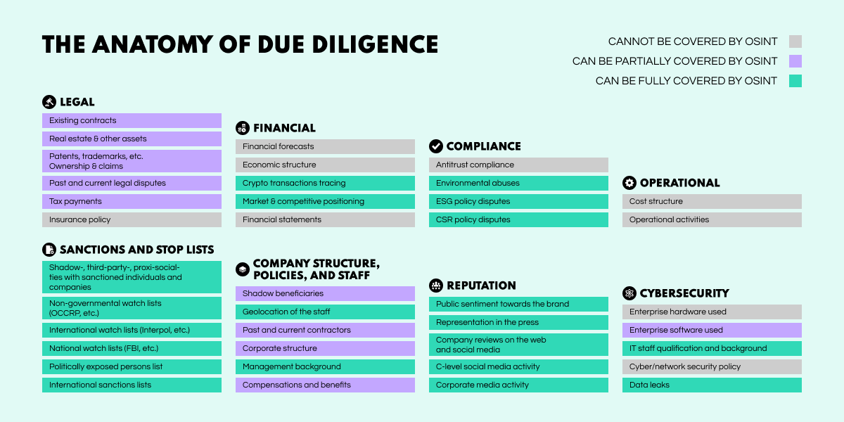 It is essential to understand that the role OSINT plays in due diligence is supportive, as the bulk of the work still falls on accounting and the legal side of things. However, open-source intelligence can still provide value for gaining powerful insights to help companies make informed decisions. Here’s how OSINT fits into the various departments: