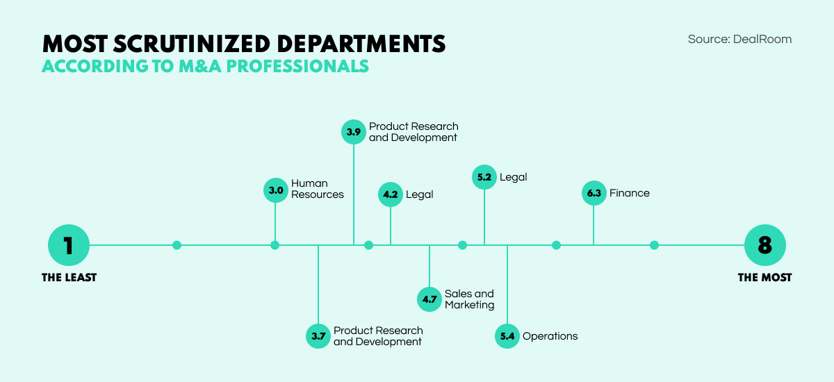 Having a paper trail to prove the company's actions can be a lifesaver in successfully concluding M&A deals. ‘Legal’ serves as an umbrella term, covering any official documentation as well as accounts records. Gathering all contracts, real estate records, patents, tax receipts, and other required documents makes it possible to back up or debunk claims made by individuals and corporations.