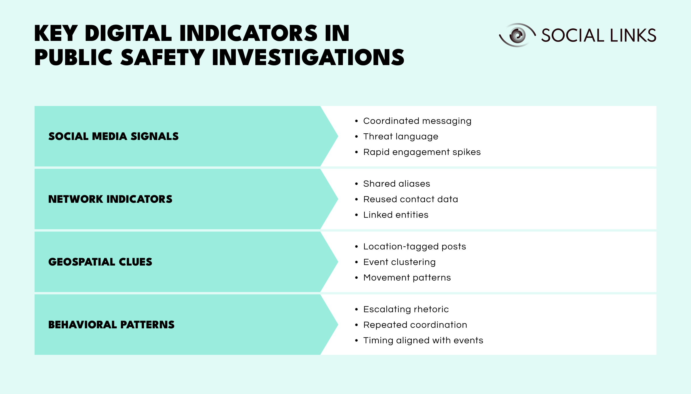 One of the most valuable uses of OSINT in public safety is early risk detection. Escalating online behavior, discussions about targets, or coordinated messaging can act as early warning signals. When validated through multiple data sources, these indicators support timely intervention and preventive action.