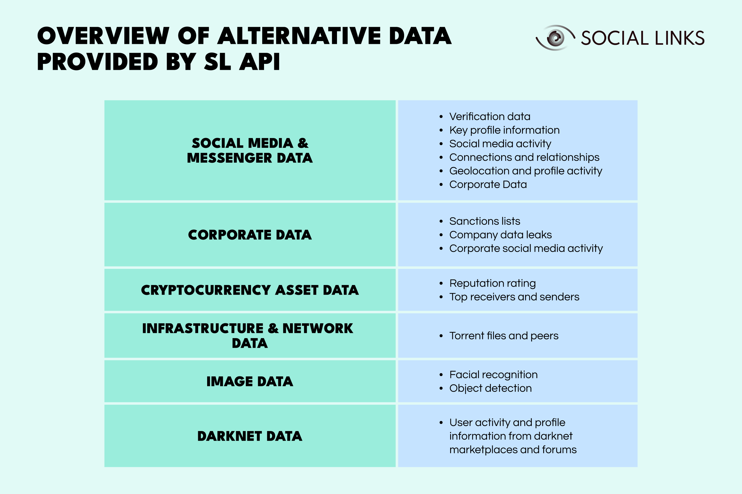 Social Links API provides access to vast quantities of public data from both mainstream and niche social networks and messengers—this includes details of users, profiles, communities, groups, and pages, plus media published by users and more. While these data points may have a direct bearing on particular query, such information can have huge utility through less-obvious applications: