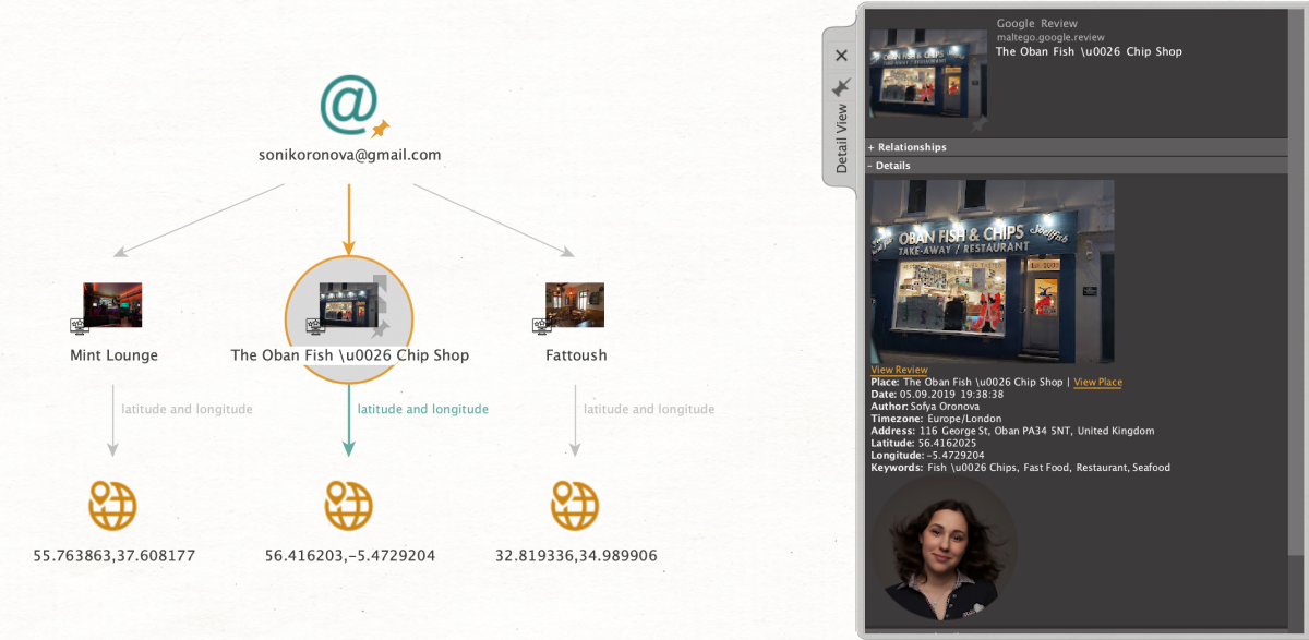 How It Works: Say we just have an email address which we want to generate a digital footprint. Google Reviews search methods may be one effective approach to achieve this. We simply run the search method [Google] Get Reviews from our starting email entity to retrieve all establishments which the subject either commented on or gave a rating to. The properties tab will give us important data including name, geolocation, and a photo. By then running a facial recognition search we can determine our subject’s digital presence across social media platforms such as Facebook and Instagram and expand the digital footprint.