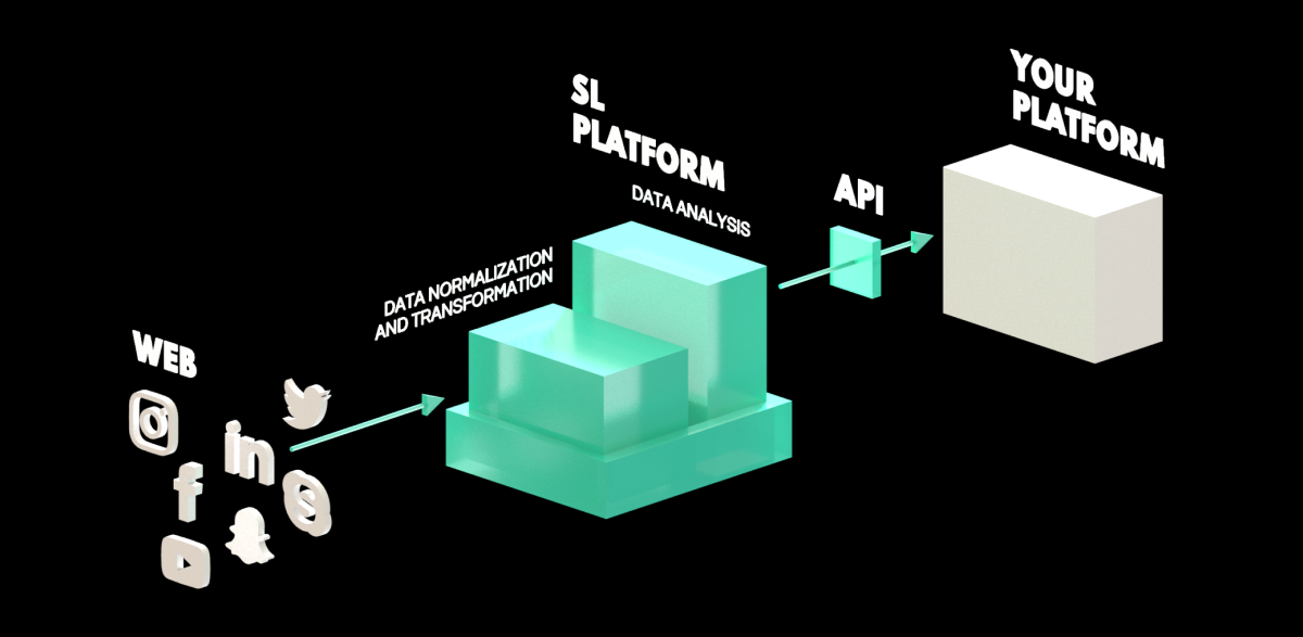 How It Works: Once the client infrastructure has been integrated with SL API, users can channel unstructured open data through SL Professional to receive all necessary data in a structured, usable JSON format. SL API essentially operates as a bridge which directly connects the client system to the Social Links platform via data modules. This information can then be brought into and used in any relevant workflow.