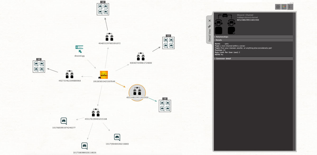 How It Works: Say we are looking for individuals with extremist affiliations. We can begin our search in two different ways. Using a phrase entity, we can find a server by keyword, or we can use a link entity and enter the URL, then run the search method [Discord] Search Servers. From the new server entity we can now run [Discord] Get Channels followed by [Discord] Get Messages.