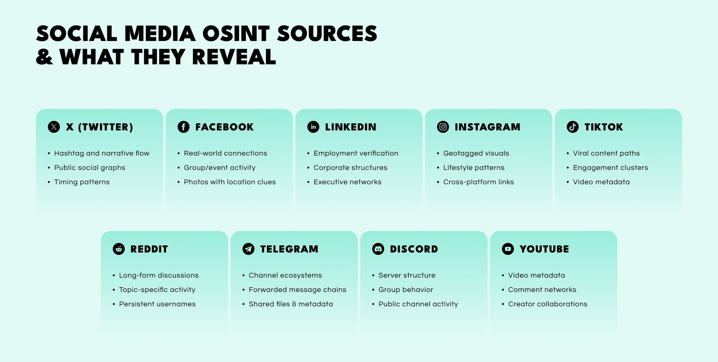 Each one offers different signals: X for narrative flow, Facebook for real-life networks, LinkedIn for professional verification, Instagram/TikTok for visual clues, Reddit/Discord/Telegram for community behavior, and YouTube for metadata and influence mapping.