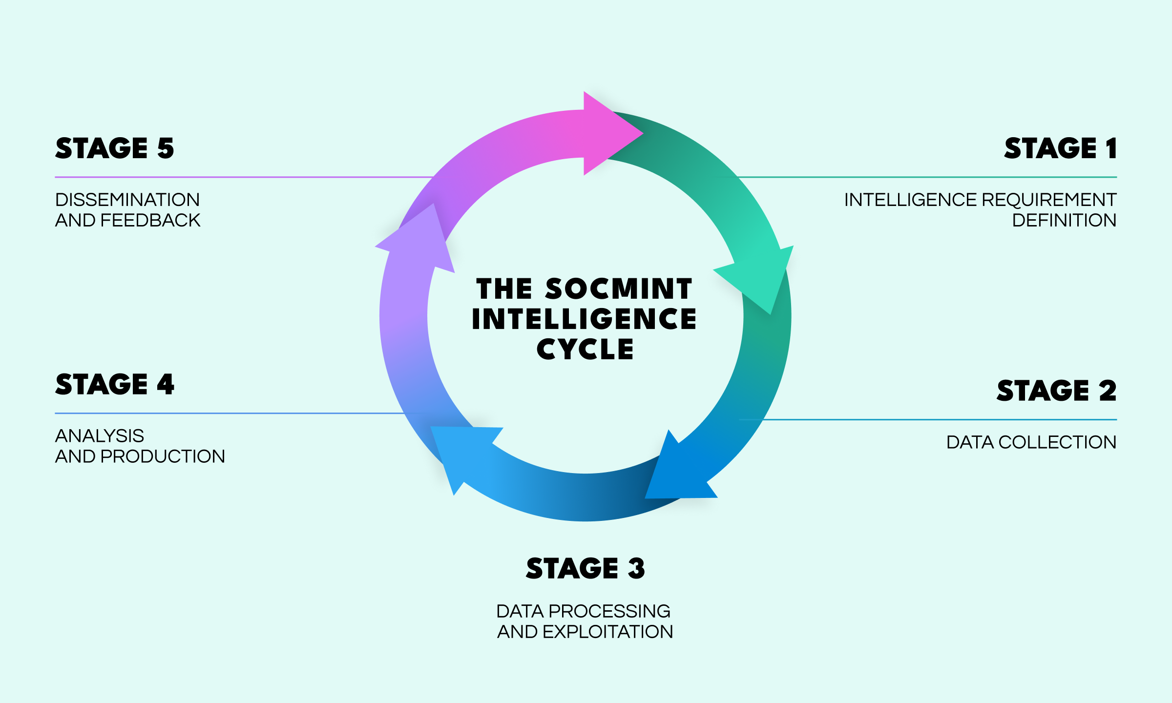 Effective social media intelligence should follow the standard and classic intelligence cycle, consisting of: