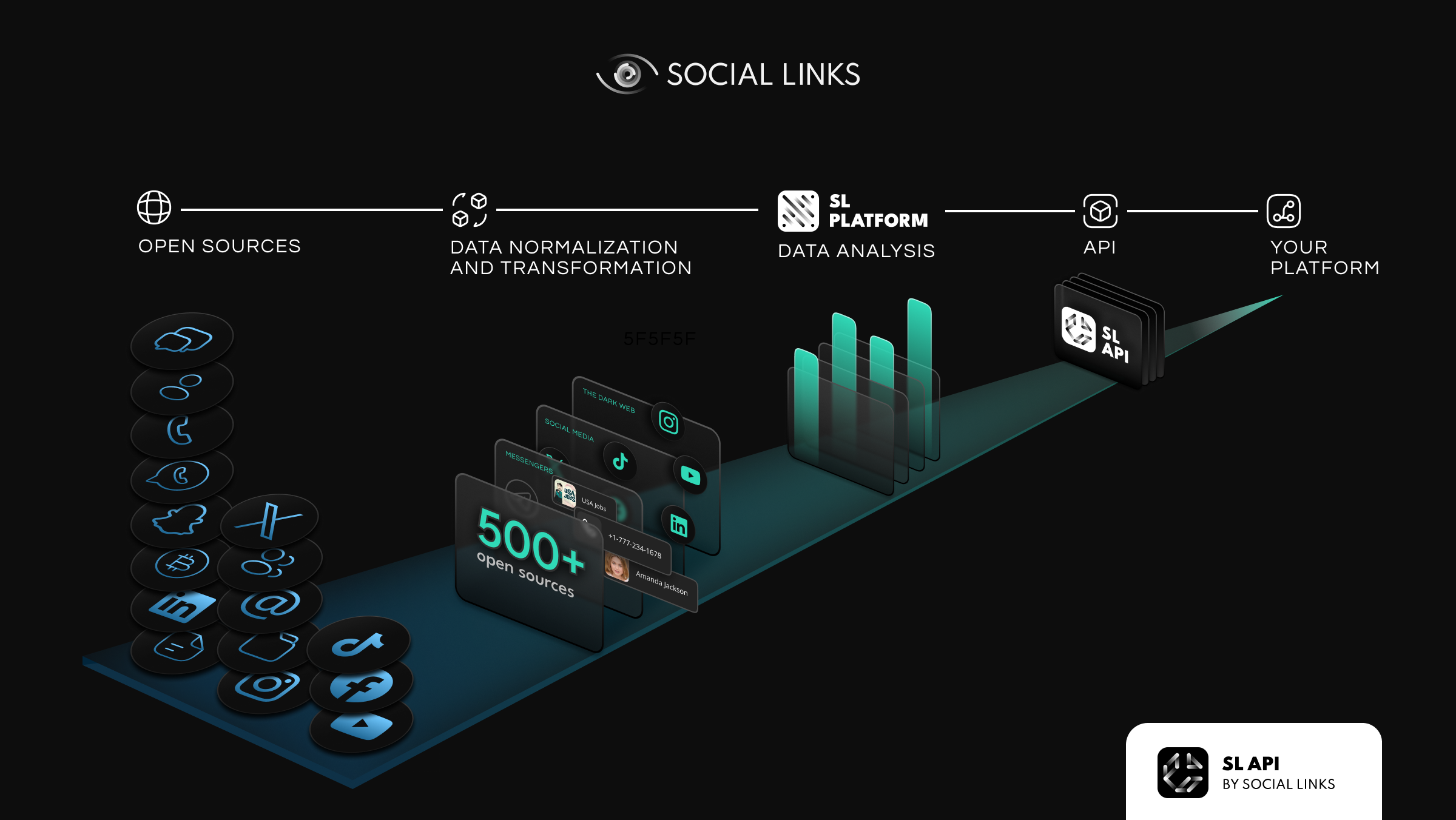 This powerhouse open data API solution delivers Social Links’ full suite of extraction and analysis tools directly to any in-house system. SL API provides a huge range of search and processing methods spanning social media, messengers, blockchains, and the Dark Web.