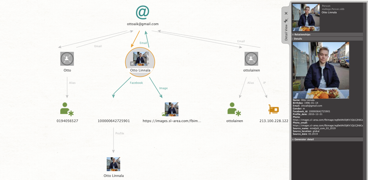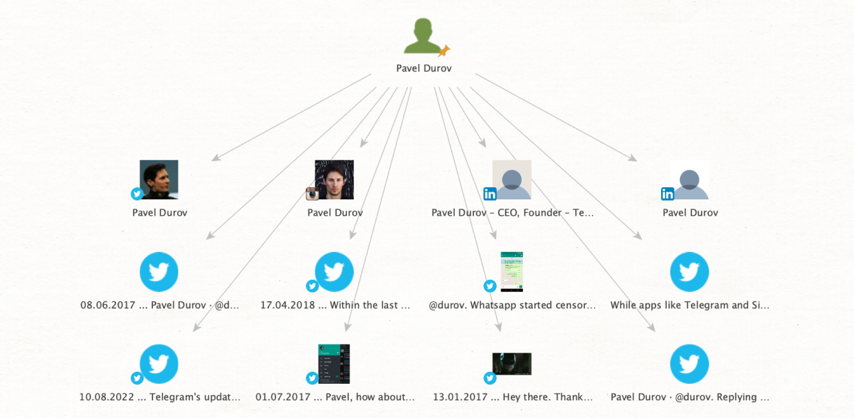 From a social media profile, we run the search method Search Relations. The results will include all profiles that our subject has interacted with, be it a post on a news feed, a comment on a post, or even a simple like. But we can also see that these entities are circles of different sizes. This corresponds to the profile’s ‘weight.’ In other words, the bigger the circle, the more interaction occurs.